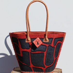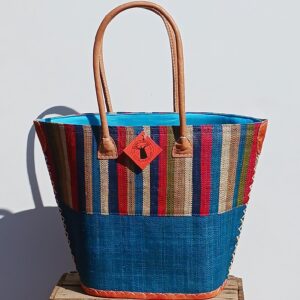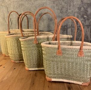 Die Körbe bestehen aus Bast und Gras sowie anderen Naturmaterialien. Sie sind handgefertigt und können in Größe und Farbe leicht variieren. Die Körbe haben eine stabile Form und die Ecken sind mit Leder verstärkt. Auch die Henkel sind aus Leder genäht, wodurch sie weich und angenehm zu tragen sind.