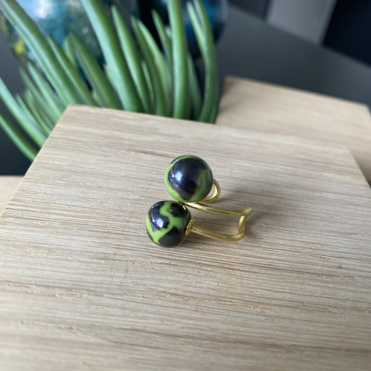 Strikkering udført i messing med 2 små keramikperler.
