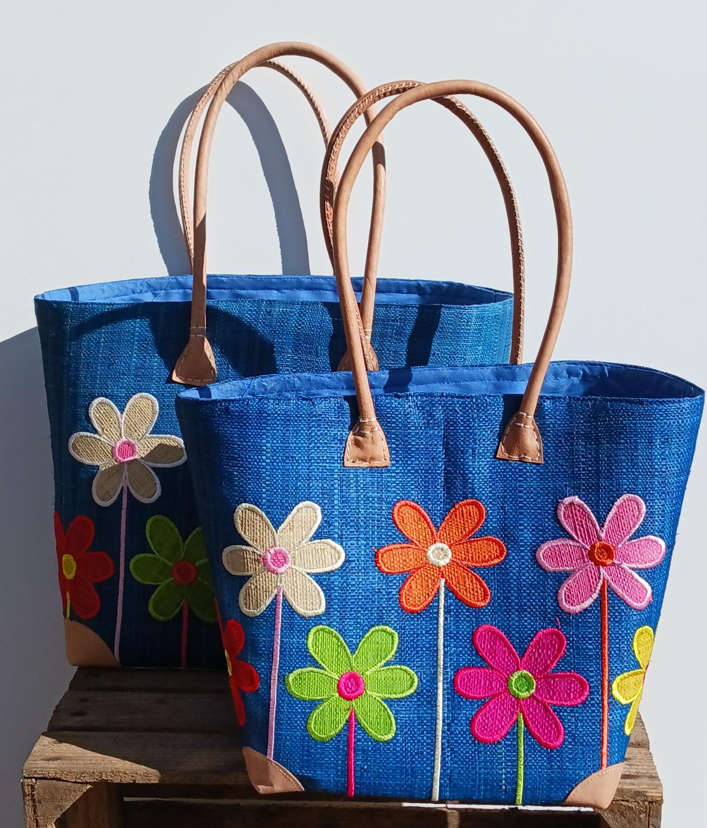 Madam Græskar bast kurvetaske – Mørk Blå m. blomster motiv