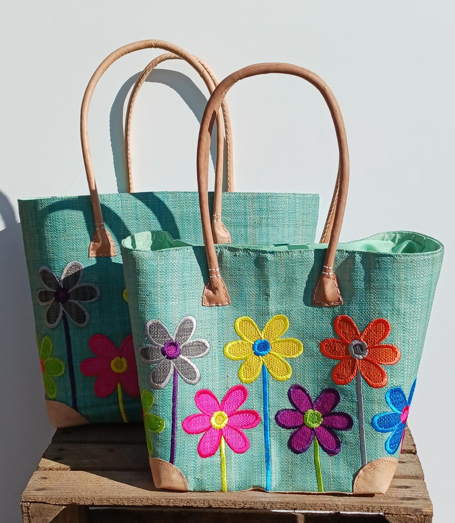 Madam Græskar bast kurvetaske – Turkis m. blomster motiv